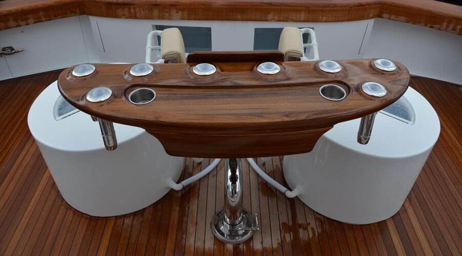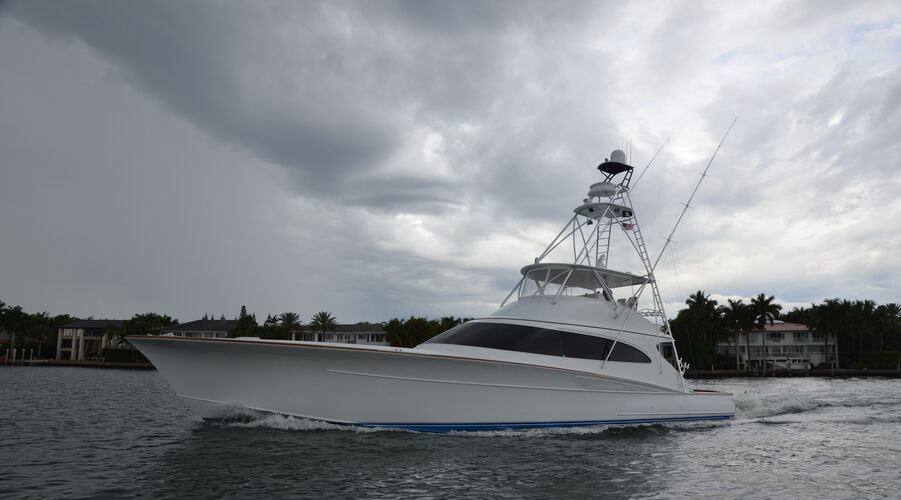 Despite her head-turning good looks, her design, shape and profile are first and foremost based on her intended purpose. Low, sleek, and appearing as if in constant motion, she is in perfect proportion to her length. Whether viewing her landing strip foredeck, the gentle slope of the house with its familiar black brow or the open bridge design with its massive and fully functional Palm Beach tower, everything about De Bait Able is in harmony and balance. And even up on the bow, her removable casting station and flush-mounted livewell make sense.
