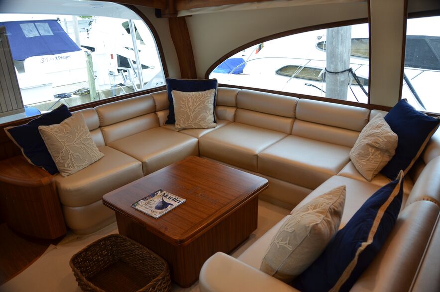 The expansive salon has C-shaped -seating to port with a Release Marine custom teak table featuring storage below. The fully found galley lies forward; opposite, a spacious dinette, under which is an electrically operated rod storage drawer. Of particular note here is the distinctive overhead cutout that adds an effective and special design statement to the area.