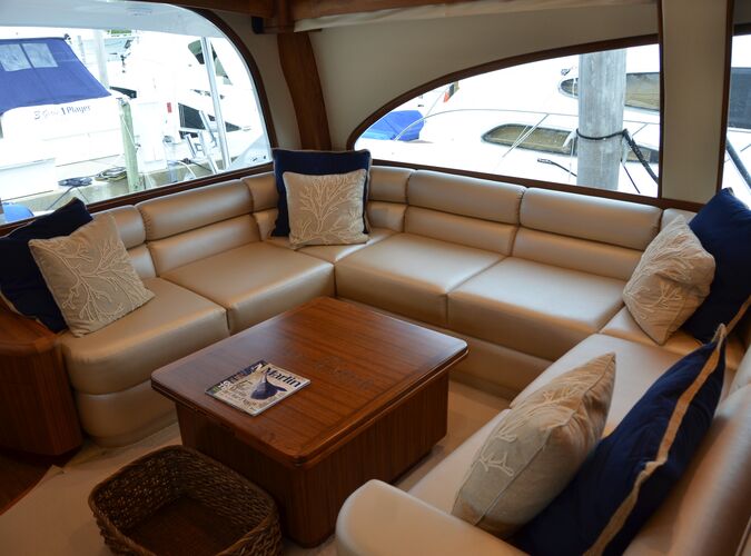 The expansive salon has C-shaped -seating to port with a Release Marine custom teak table featuring storage below. The fully found galley lies forward; opposite, a spacious dinette, under which is an electrically operated rod storage drawer. Of particular note here is the distinctive overhead cutout that adds an effective and special design statement to the area.